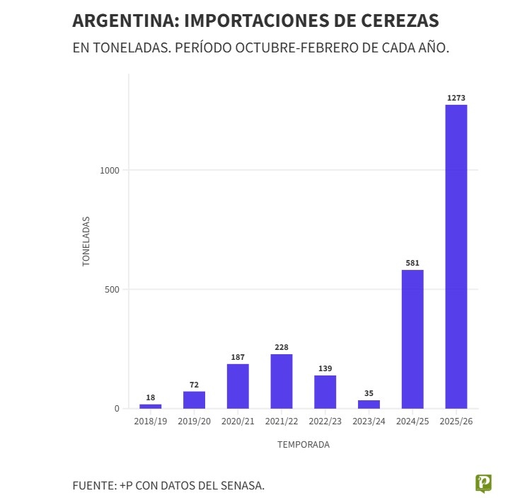 The 2025/2026 cherry season will be remembered as a true turning point for the Argentine market. This is not only due to the challenging international context and the adverse weather conditions that affected local production, but fundamentally because of a key statistic that marks a clear before and after: between October 2025 and February 2026, imports totaled 1,273 tons, the highest volume ever recorded by Argentina.