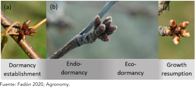 The foundations for the current understanding of dormancy were established in the mid-20th century (Perry, 1971 and Doorebos, 1953), but it was not until 1987 that the terminology we use today was coined to better describe the three distinct stages within this continuous phase, which are: para-dormancy or dormancy induction, referring to the cessation of vegetative growth imposed by other organs of each plant due to the production or inhibition of molecules such as apical dominance, and is primarily influenced by low nighttime temperatures, which accelerate leaf drop.
